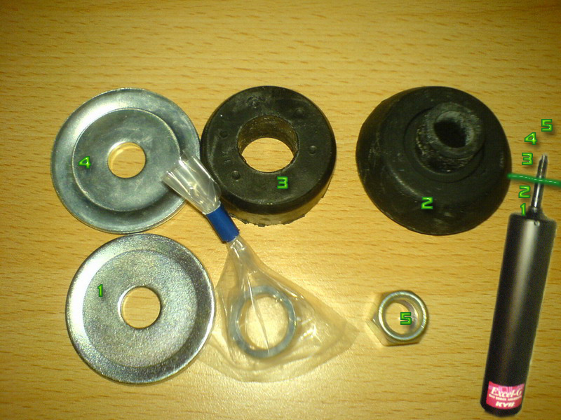 Na auf den Original-Dämpfer ist doch alles zu erkennen.Ist nicht oben in der Karrosse ein großes Loch wo die Kolbenstange eingesteckt wird.Von oben dann die Mutter und die Scheibe und von innen zum Kontern die Gummis. :(