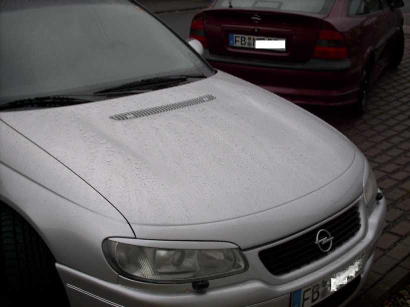 Nachdem ich den Sommer Über den Wagen wieder verjüngt hatte, alle Plastikteile ab ... Gummi ab ... evtl. Rost entfernen wurde der Wagen komplett lackiert ... nicht weil es nötig war ... aber für polieren wars zu spät und schließlich sollte er ja top aussehen. ... dann in Urlaub gefahren und da war es wieder das Problem : Ab 220 im Sommer wurde der Motor leicht 100°C heiß ... tendenz steigend ... bei einem kleinen Stint gegen A6 und BMW konnte ich das nur machen in dem die Klimaanlage aus und die Heizung auf max. stand ... schade um die neugelackte Haube aber eine Lösung müßte her. Also noch ne 2te Opel-Haube gekauft+3.Haube (BMW) gekauft und den Lufteintritt der BMW - Motorhaube zum Luftaustritt auf der Omega Haube umgeschweißt. Alles in Blech gearbeitet, kein GFK-Kram der nach 3 Kanaldeckeln reißt. Alles funktioniert wieder und das beste ist knapp 5°C Wassertemp - Vorteil . Ab 180 kommt soviel warme Luft aus der Haube das bei leichtem Regen auf dem unteren Bereich der Frontscheibe die Wassertropfen von außen an der Scheibe trocknen. Das gibt von außen an der Scheibe trockene Wasserflecken. Unglaublich wieviel heiße Luft da nun ausströmen muß. Auch im Stand / Stadtverkehr die Flatterlaufzeiten sind deutlich kürzer. Das Ergebnis seht Ihr im Bild ... und ach ja ... ich habe jetzt nun eine neulackierte Serien-Omega-Haube zu verkaufen ![]()