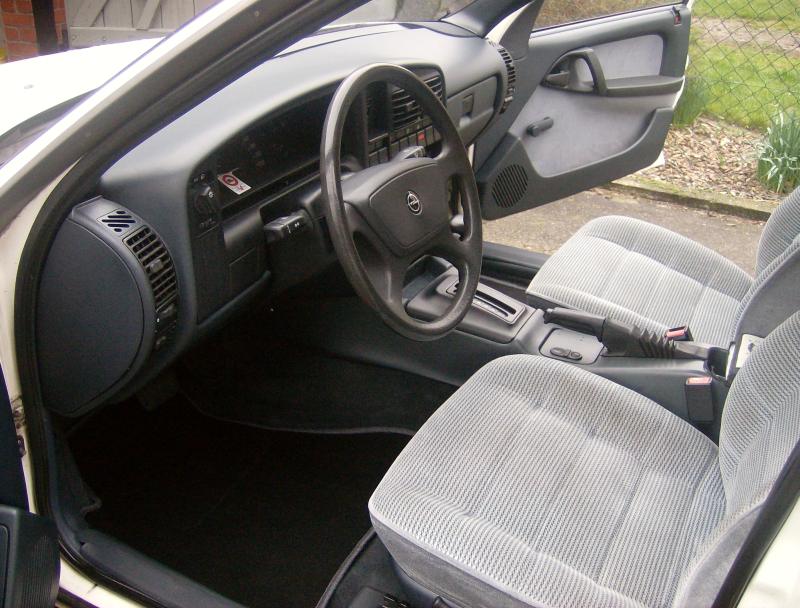 Im Serienzustand: Weiß, Anhängerkupplung, Opel-Alu's, Blaue Velour-Ausstattung, ZV, BC, Heckscheibenrollo, Kopfstützen hinten, umklappbare Rücksitzbank