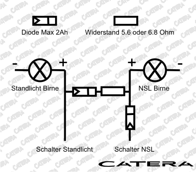 Das heißt ich müsste eine Diode reinmachen, damit wenn ich die NSL aufdrehe, der Strom nicht zum restlichen Rücklicht kommt. Weiters muss ich aber einen Widerstand vom RL zur NSL reinmachen, damit da nur 5Watt leuchten.
