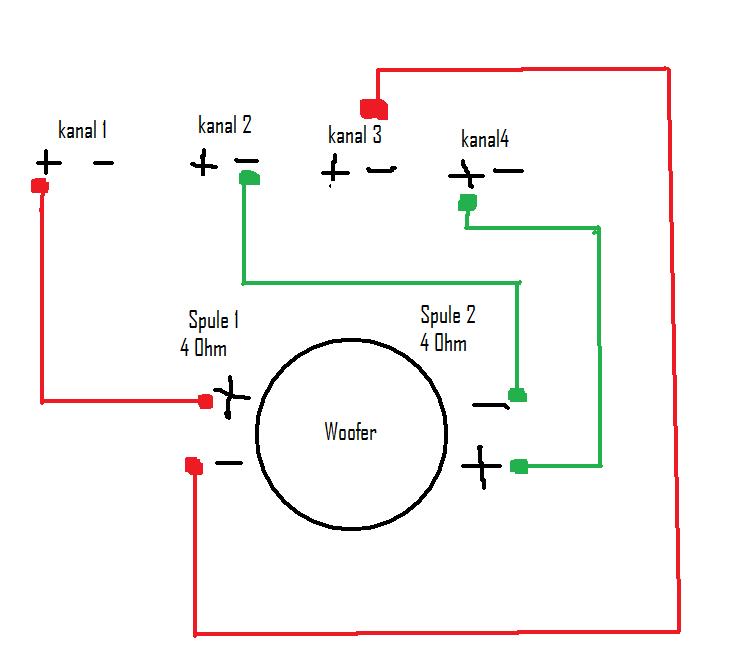 du hast einen Woofer mit 2X4Ohm, wenn du am Woofer +/+ und -/- verbindest hast du 2 Ohm dann kannst du aber nur zwei (gebrückt) von vier Kanälen benutzen. (Zwei Kabel)