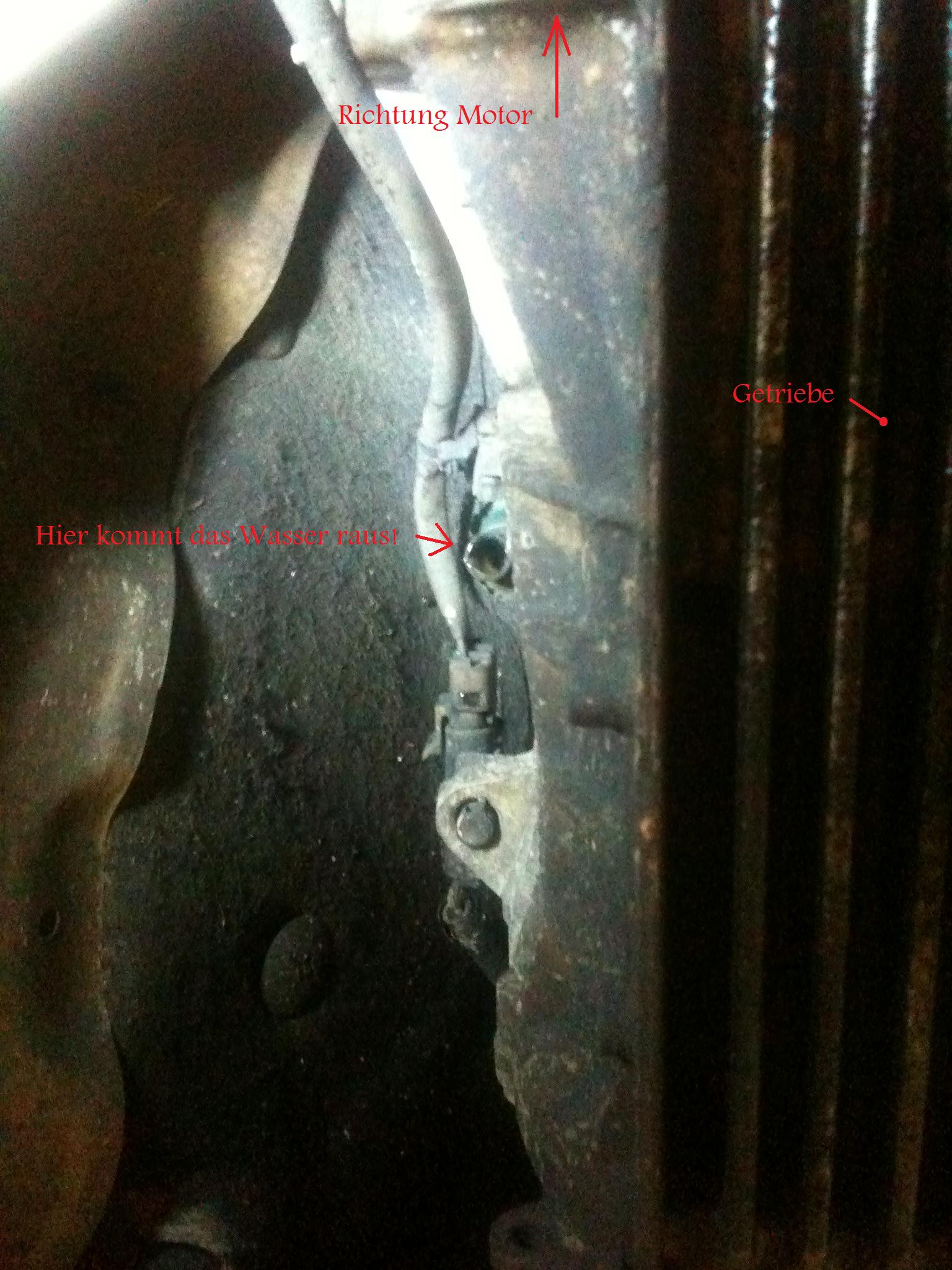 Guten Tag, ich habe folgendes Problem -> Mein Omega B 2,5l V6 verliert unmängen an Kühlwasser! Ich hab mal nachgesehen und auch etwas gefunden. Und zwar befinden sich über dem Getriebe zwei Schläuche (siehe Bild) aus dem vom ersten Bild kommt sehr viel Wasser. Aus dem vom zweiten Bild tropft es nur ein wenig. Ich denke mir das einer der beiden Schläuche der Ablauf für die Klima ist allerdings verstehe ich dann nicht warum da Kühlwasser raus kommt. Es ist auch egal ob der Wagen warm oder kalt ist, wenn ich oben Wasser rein kippe kommt es auch fast genau so schnell wieder unten raus ob warm oder kalt. Kann mir jemand sagen was da schief läuft??? Oder wo die beiden Schläuche hin führen???