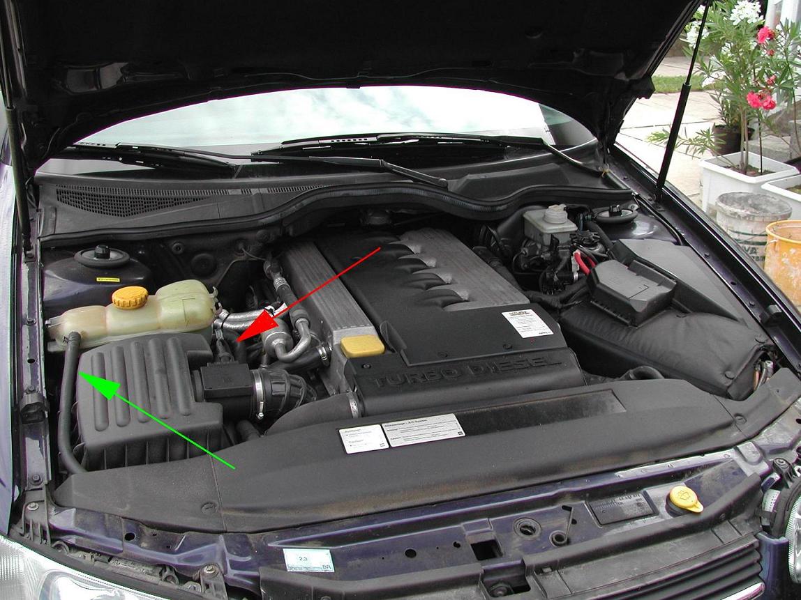 Der Motor muß ganz kalt sein. Lasse evtl. noch vorhandenen Kühlsysytemüberdruck ab, indem Du den Deckel des Ausgleichsbehälters kurz abschraubst. (Danach wieder verschließen.)