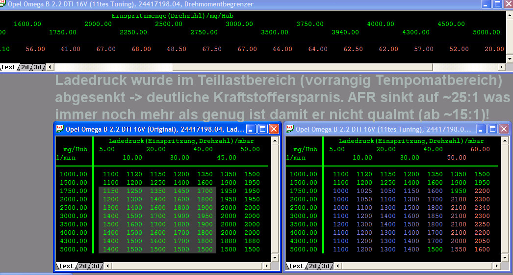 Januar werde ich auf den Prüfstand fahren und mit dem derzeitigen Ladedruckkennfeld drei Messungen vornehmen, einmal mit 65 mg/Hub, also wie es programmiert ist und dann + und - 5%.. via OP-COM. D.h. 61,75 mg/Hub und einmal 68,25 mg/Hub bzw. einfach generell 3,25 mg/Hub weniger übers den gesamten Drehzahlbereich.