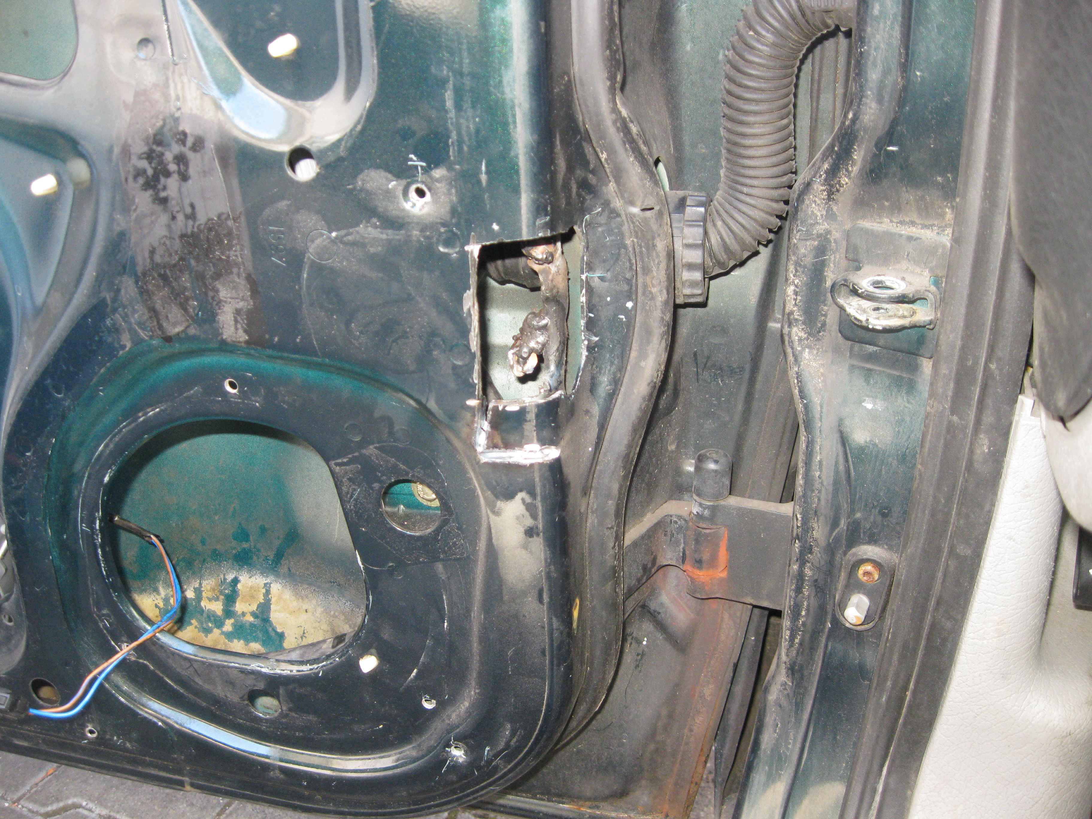 Offensichtlich war versucht worden, den Türstopper direkt in die Tür zu schweißen, was gründlich in die Hose ging. Auf den Sch(w)eißknödeln war kein Reparaturblech auch nur halbwegs genau zu positionieren. Ich hatte es 2 mal versucht, hat auch funktioniert, war aber extrem schwergängig und laut. Natürlich hat es mein Blech nach kurzer Zeit wieder zerlegt. Tür ausbauen (dazu hätte ich mir einen Splinteaustreiber bauen müssen) hätte es auch nicht gebracht, da ich dann noch immer nicht an die Schweißknödel drangekommen wäre.