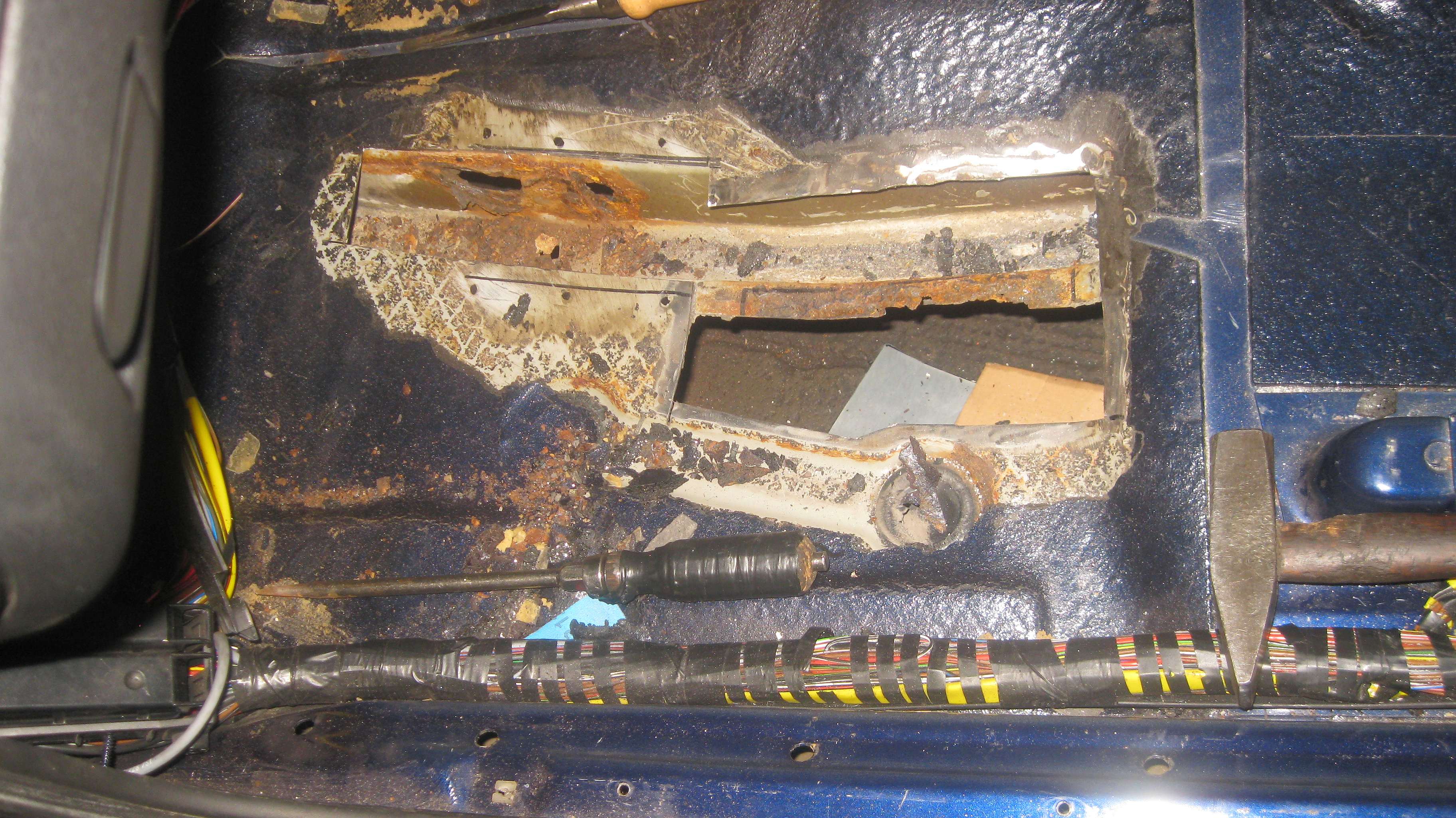 Ich spiele daher mit dem Gedanken, da von oben ranzugehen. Da das Gestühl, die Konsole und der Teppich samt Dämmmaterial sowieso raus sollen (bzw. teilweise schon sind) könnte ich doch das Bodenblech über der Schadenstelle auftrennen und den Längsträger ganz bequem von oben verarzten und anschließend das Bodenblech wieder einzuschweißen. Ich gebe zu, etwas unkonventionell...aber immerhin hätte man bei der Arbeit ein Dach über dem Kopf, in Anbetracht der Jahreszeit sicher vorteilhaft....