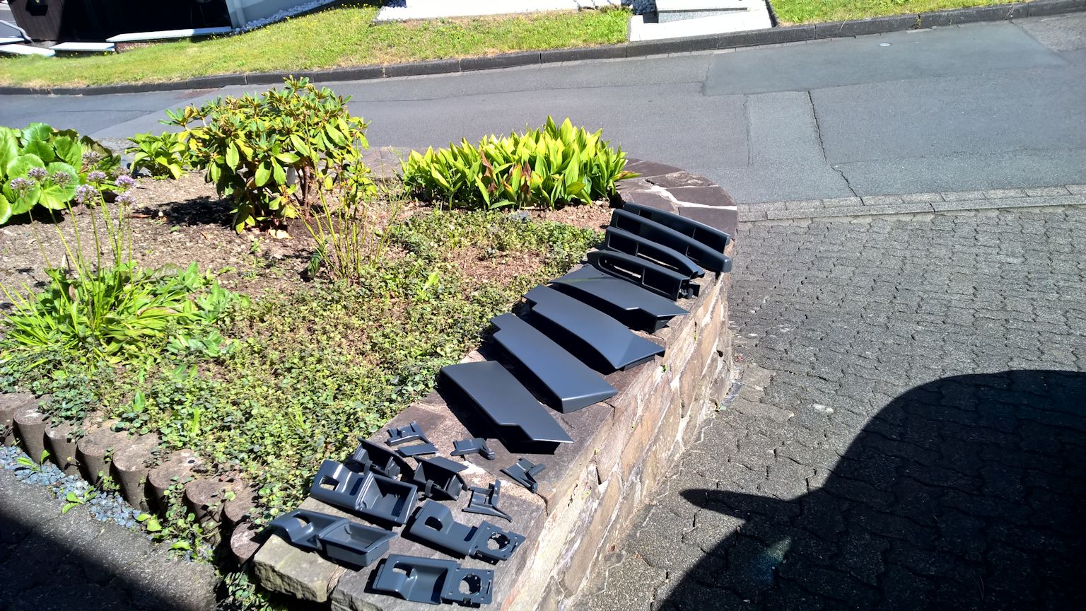 Bei dem Omega sind es 4 Türen und damit eine Menge Arbeit. Sobald die Kunststoffteile und Klappen alle demontiert sind, müssen diese vom Softlack befreit werden. Das geht am schnellsten mit Nagellackentferner OHNE Aceton. Diesen gibt es in 10 Liter Gebinde günstig bei Ebay. Ich habe dann ein großes Gefäß genommen und es mit dem Entferner gefüllt. Je ein Kunststoffteil muss dann ca. 5 Min. darin liegen und man kann mit einer Bürste den alten Lack entfernen. Nachdem das geschehen ist, müssen alle Teile zum neu lackieren vorbereitet werden. Das heisst ich habe alle Teile mit 320er Schmirgelpapier nass geschliffen um wieder eine neue schöne glatte Oberfläche zu erhalten. Dieser ganze Vorgang mit Demontage, Entlacken und Schleifen dauert gut 2-3 Tage. Wenn das getan ist gehen die Teile zum Lackierer. Beim Farbton handelt es sich um grauschwarz nach RAL 7021. Ich habe extrem strapazierfähigen Möbellack in seidenmatt genommen. Dieser wird 10:1 mit Härter gemischt und ist sogar ringfest. Der Lack kostet etwas, kann aber enorm viel und sieht sauber aus. Habe auch die Türgriffschalen mit lackiert.