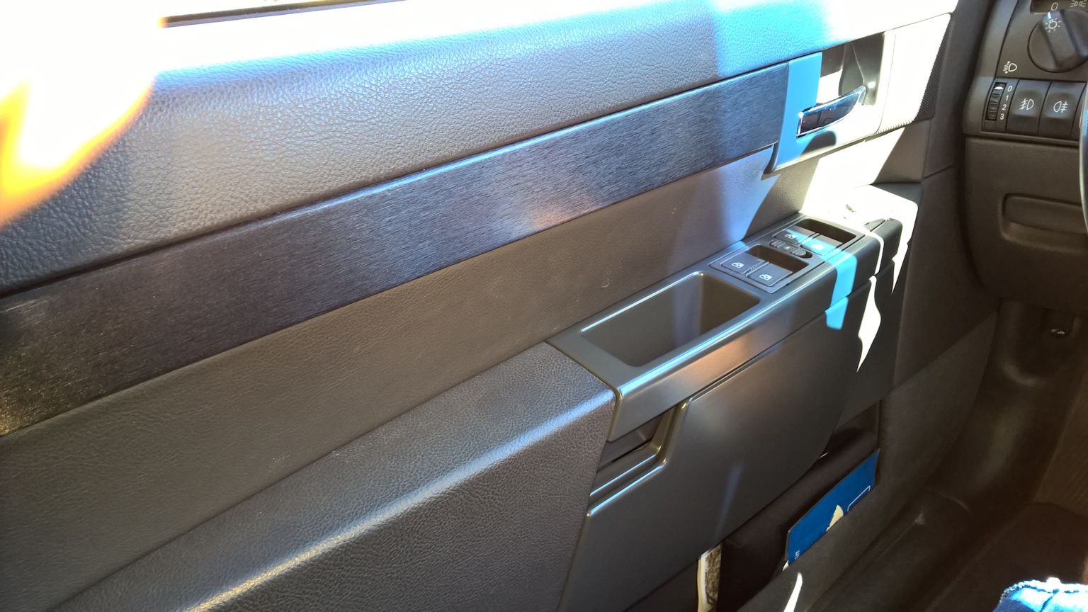 Dabei meine ich die Lackierung der Kunststoffteile an den Türen, welche ja mit dem schrecklichen Softlack behaftet sind. Darüber hinaus habe ich die Wurzelholzleisten mit Folie überzogen.