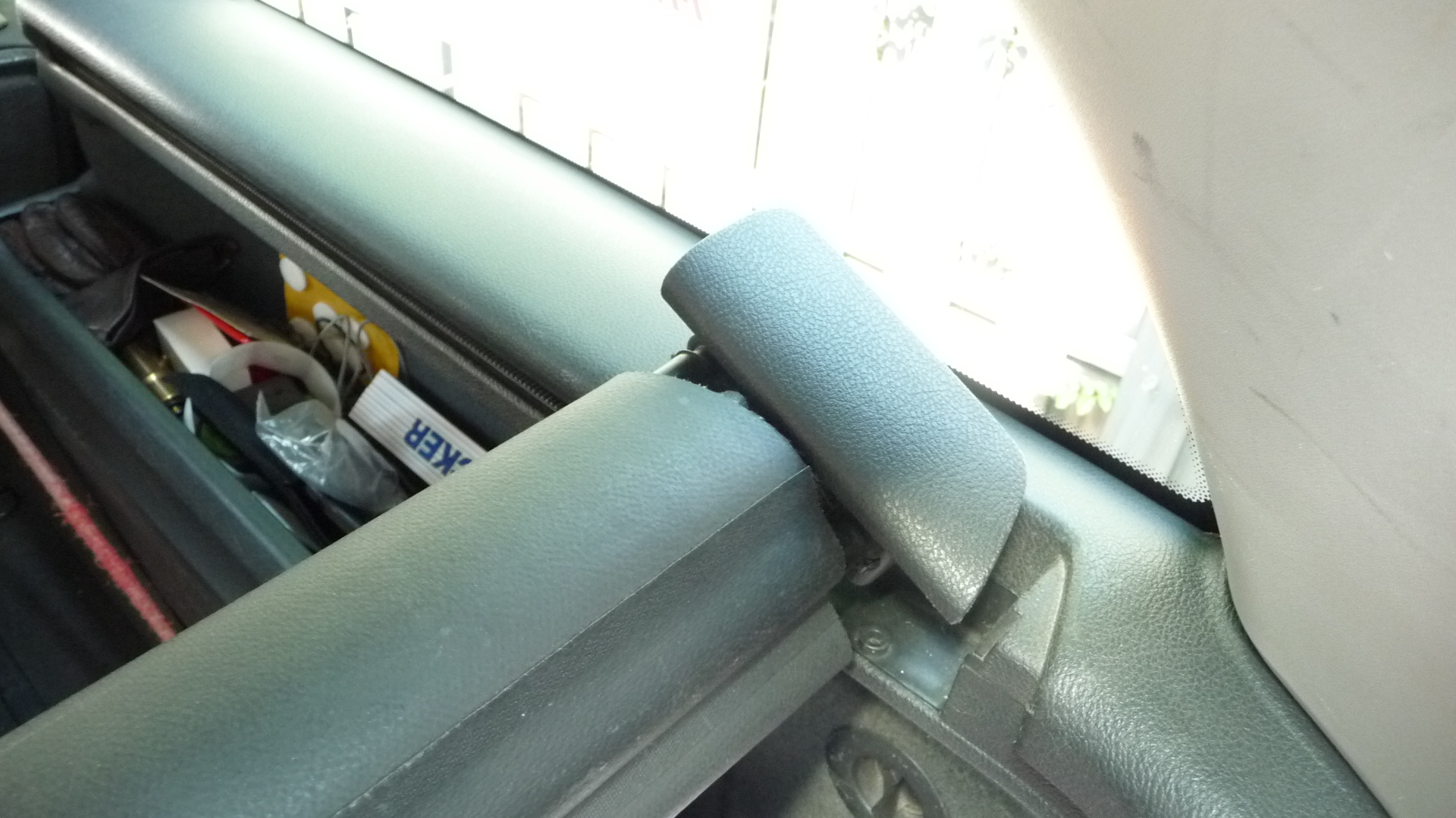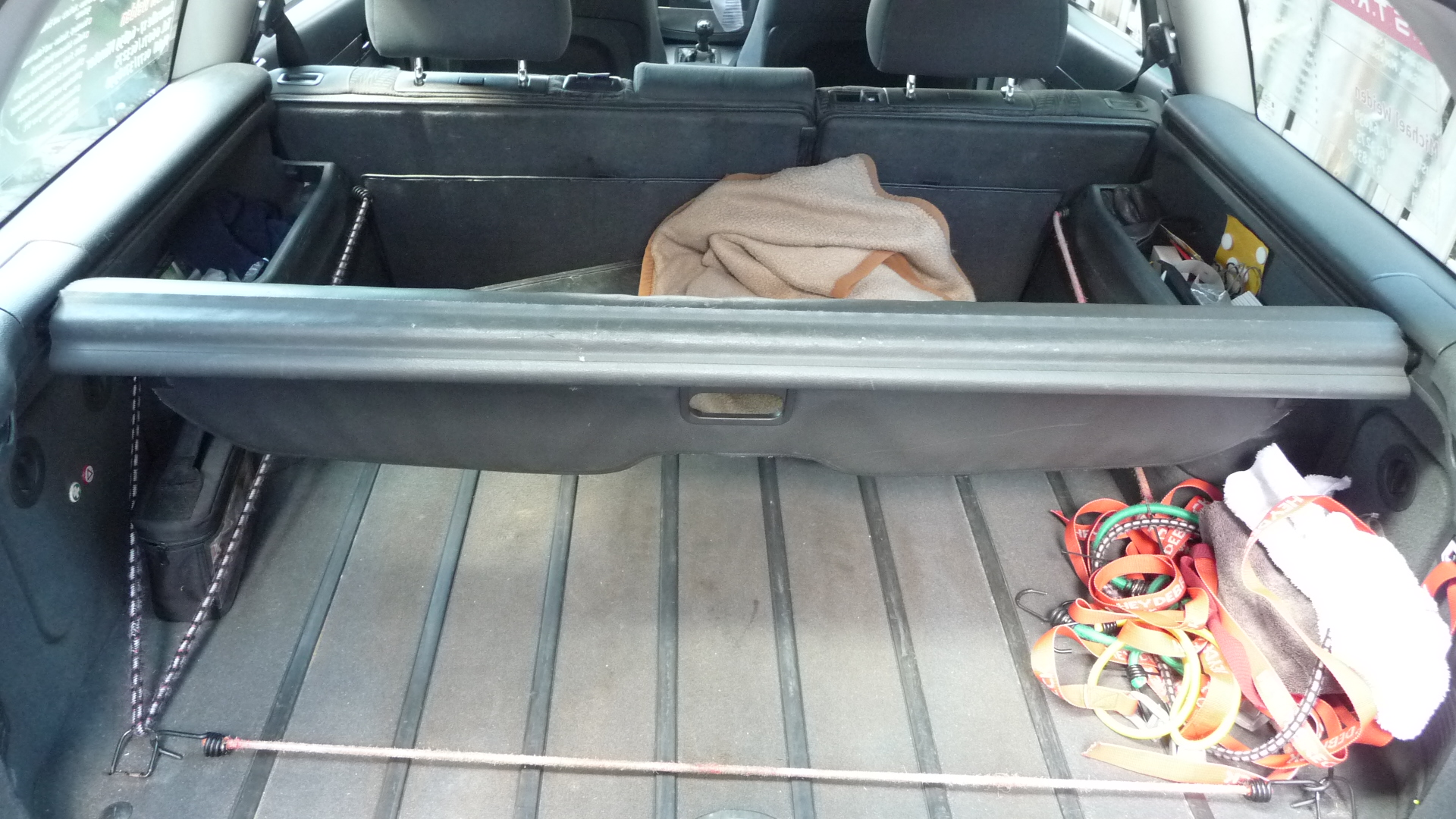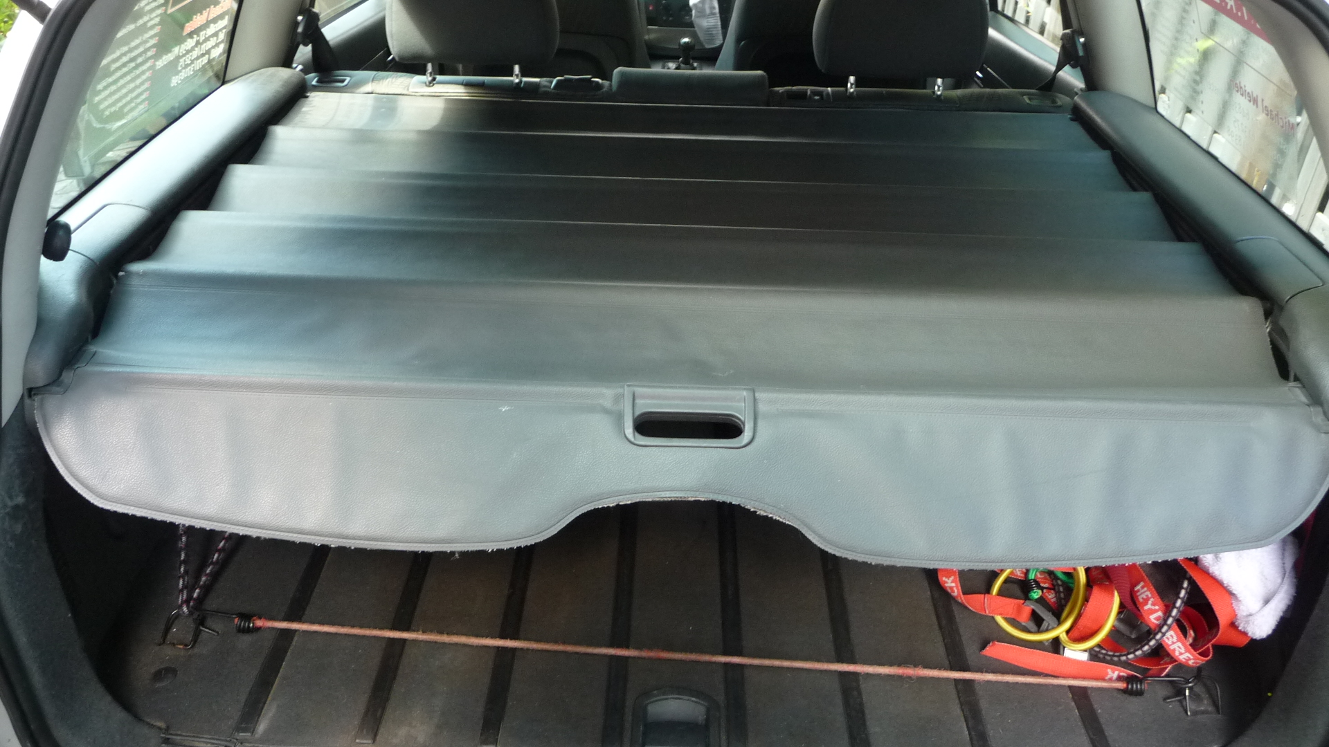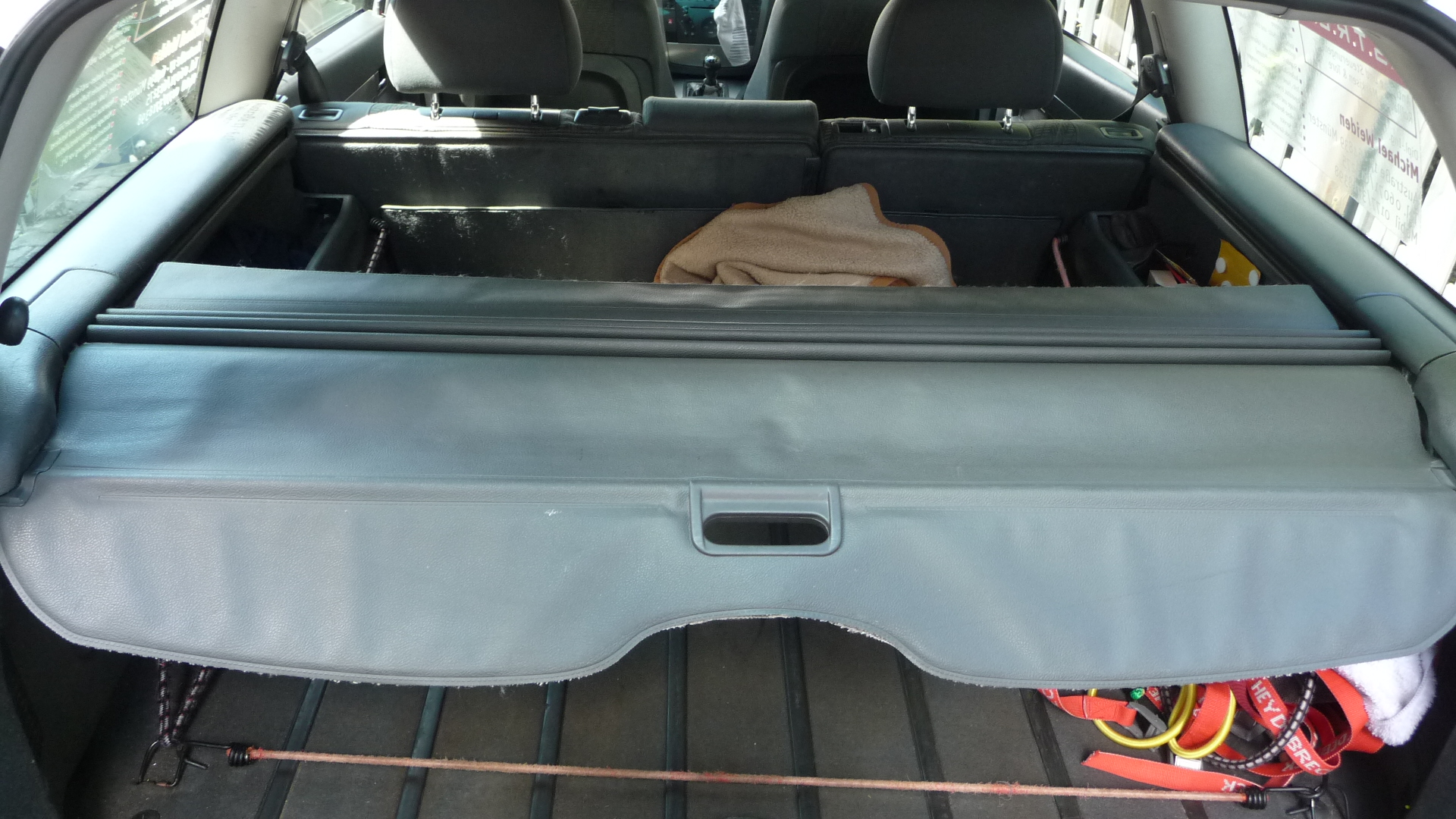 Ab und zu muss sie halt mal ausgebaut werden: zuerst zieht man die Stangen komplett von den Rücksitzlehnen her nach hinten bis zum Anschlag. Dann das hintere Ende mit dem Griffloch nach vorne ausschieben und überschlagen. Nun kann man das Paket rechts und links nach oben ausrasten.