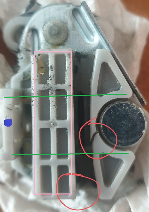 Die Führung, die die Seitenscheibe hoch- bzw. runterfährt ist gebrochen. Ich glaube fast, dass dieses Teil nicht einzeln zu erwerben ist, außerdem ist es mir irgendwie auch ein Rätsel, wie das zusammengebaut wurde (wahrscheinlich im Ganzen...), da auf der Rückseite des gebrochenen Plastiks noch eine Art kleine Metallabdeckung ist, die an eine andere Stelle gar nicht passt...nunja, hier das Problem