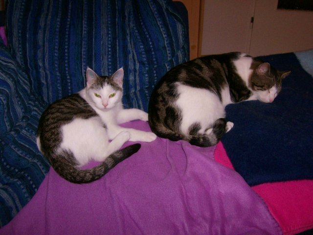 Ich hab' mir vor zweieinhalb Wochen auch zwei Stubentiger aus dem Tierheim geholt. Der Kater soll wohl drei jahre alt sein und seine kleine Halbschwester wird im Mai ein Jahr.