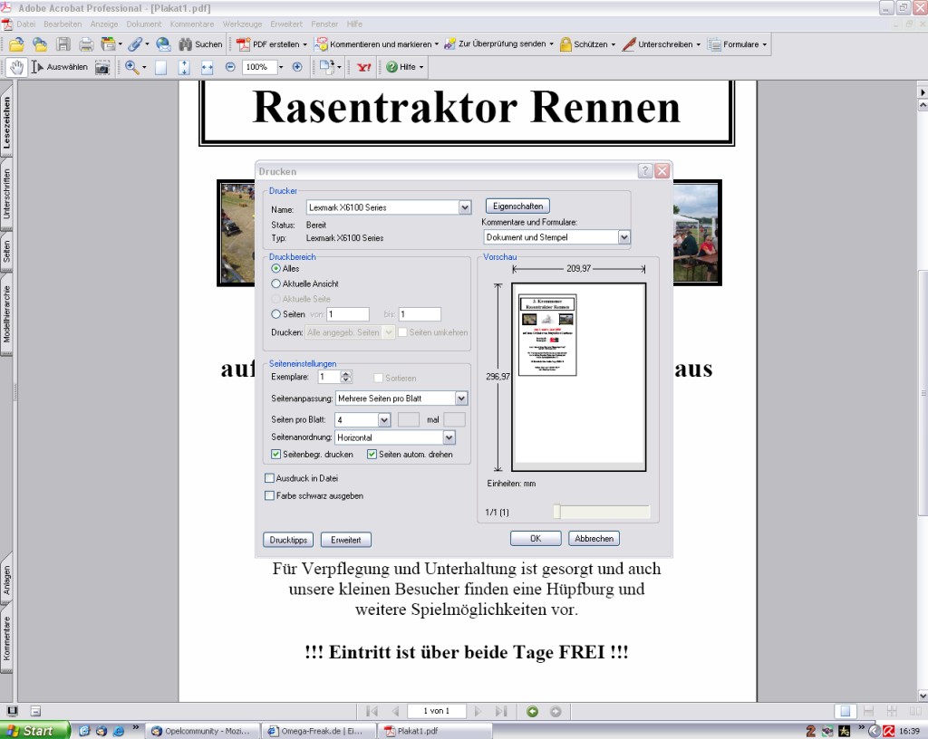 sacht mal... hat von euch jemand einen Plan, wie ich es am gescheitesten anstelle, das eine PDF Datei, welche normal die Größe A4 hat im Adobe Acrobat 7.0 Prof. so platziert und verkleinert wird, das sie 4x auf ein A4 Blatt geht. Also 4 Seiten pro Blatt. Hoffe ihr versteht was ich meine *gg*