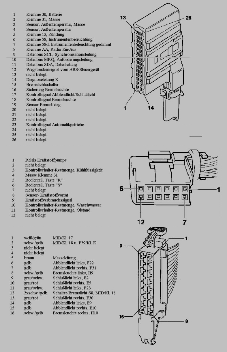 Jetzt zeig das Ding jedesmal an daß der Kühlmittelstand nierig ist ist aber voll.Bremsbelag zeigt er auch an aber die Bremsbeläge sind gut und die Sensoren hab ich auch neu reingemacht.Abblendlicht zeigt er auch an ,aber alle Lampen gehen.Wischwasserstand zeigt er auch noch an is aber auch voll ?(.Hat einer von euch einen Plan?Sind nicht alle Pins im Kabelbaum belegt?
