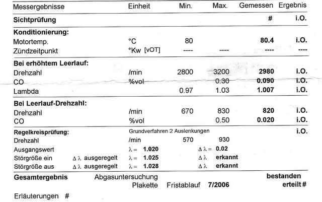 Die AU wurde zwar bestanden, aber der CO Wert bei 3000U/min von 0.209% so lala find ich. Bei der AU vor zwei Jahren war dieser Wert noch bei 0.090 %.