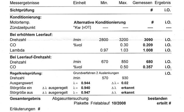 Die AU wurde zwar bestanden, aber der CO Wert bei 3000U/min von 0.209% so lala find ich. Bei der AU vor zwei Jahren war dieser Wert noch bei 0.090 %.