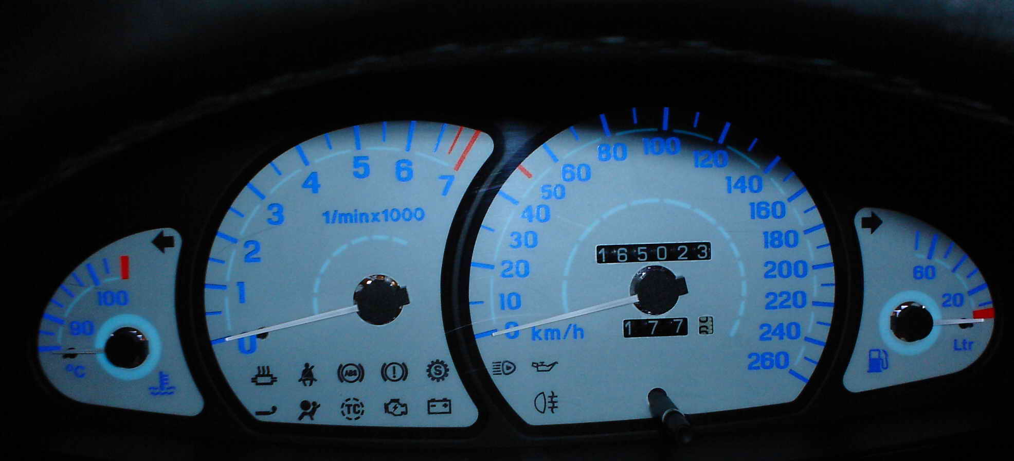 Wie Ihr seht sind die Kontrollleuchten ausgestanzt was ich ja sehr geil fand,eigendlich sollte man sie Plasma Scheiben über die Orginalen rüber legen, was aber total scheisse aussieht, weil man nie die Kontrollleuchten 1 zu 1 übereinander gelegt bekommt und das von der Beleuchtung sehr schlecht bzw. unmöglich aussieht. Also hab ich mir gedacht, nu gut dann nehme ich halt LED`s mach dann alles Rot, Blinker grün, Sportkll. Blau Fern auch blau. gesagt getan... ich los LED`s gekauft die man 1 zu 1 austauscht. Da es immer zwei in einer Packung sind muss man halt mehr kaufen ich hab halt mal 60.-€ nur für LED`s bezahlt macht man ja auch nur einmal und es sollte ja auch perfekt aussehen.
