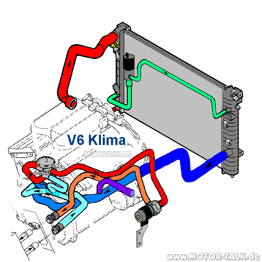 so wie in beitrag 8 ist es jetzt verschlaucht; und es funktioniert wunderbar. standheizung geht, verdampfer wird superschnell heiss, klimaanlage ok, heizung super, klimaautomatik geht, temperatur bleibt bei schneller autobahnfahrt (im gasbetrieb, 8 grad aussentemperatur) knapp unter 95 grad, temperaturanzeige schwankt nicht mehr. bleibt jetzt so, thema besiegt.