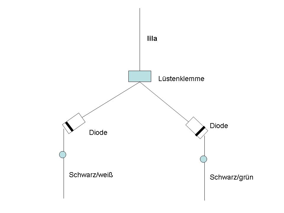 7.) Dort müßt ihr andas schwarz/weiße und an das schwarz/grüne Kabel. Ihr müßt nun das lila Kabel splitten. Also aus ein mach zwei.