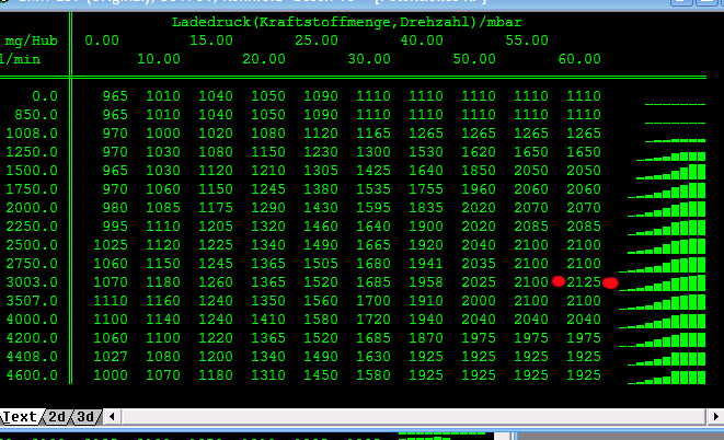 Anbei das Ladedruckkennfeld, links ist Drehzahl, oben ist Einspritzmenge in mg/Hub, in der Mitte der absolute Ladedruck in mbar. Man sieht dass der Maximaldruck (rot markiert) bei ~3000 U/Min. anliegt, zwischen 1500 und 4000 Umdrehungen bei Volllast (letzte Spalte mit 60 mg/Hub) aber immer 2000 mbar.