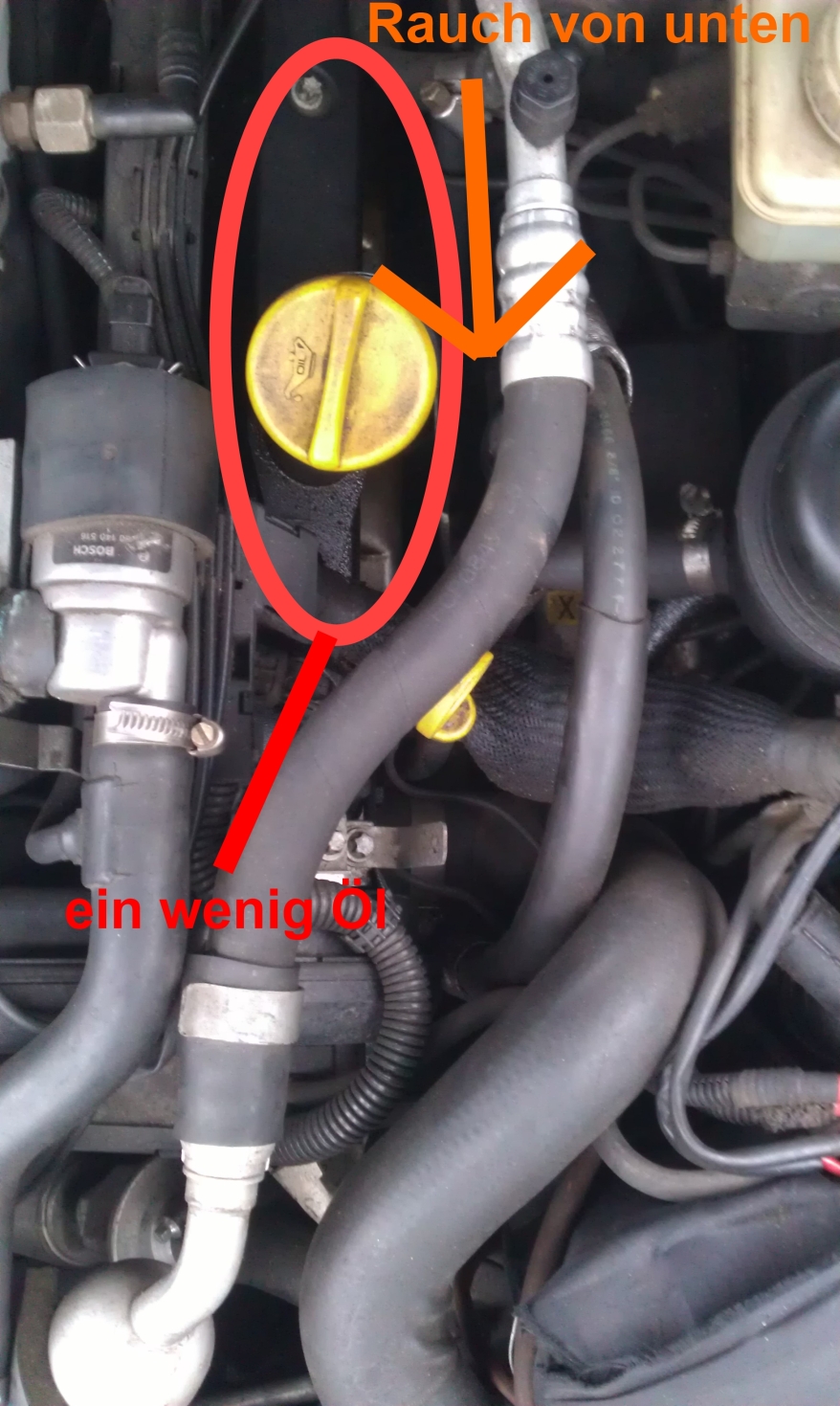 Hab dann direkt mal die Motorhaube geöffnet, um zu sehen woher der Rauch kommt. Eine direkten Auslöser konnte ich nicht sehen. War links neben dem Motorblock, von etwas weiter unten. (siehe Bild)