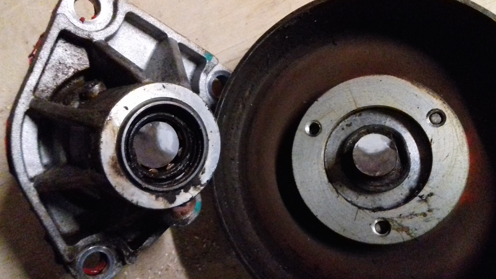Hier mal ein seltener Wasserpumpenschaden, gebrochene Welle, diese hatte wohl schon einen Knacks weg und hing nur noch 1/3