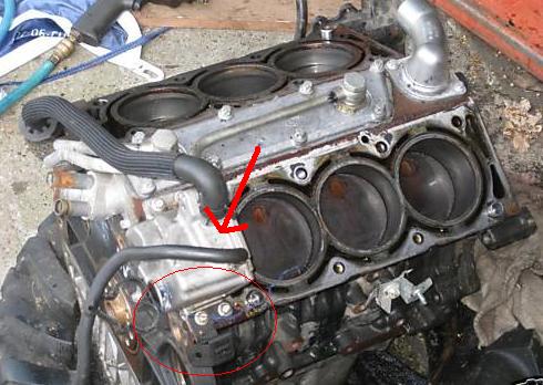 Hab ein ähnliches Problem. War heute mal auf der Bühne, das Wasser kommt bei mir irgendwo zwischen Krümmer und Motor rückseite raus und tropft dann aufs Getriebe. Die erste vermutung war Zylinderkopfdichtung. Aber heute habe ich ein Gehäusedeckel oder sowas ähnliches entdeckt(meine nicht den Anschluss von dem dicken Wasserrohr). Hab mal ein Bild gefunden, und den Bereich eingekreist wo er undicht ist. Was ist das fürn Teil wo der Pfeil drauf zeigt?
