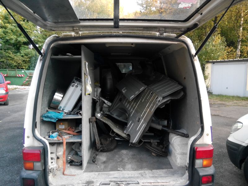 Leider hat sich herausgestellt das der Wagen einen größeren Unfallschaden hat und einen Hochwasserschaden. Es war Kiloweise Sand unter dem Dämmaterial im Innenraum. Und deshalb Rost von Innen nach Außen. Also Technik raus und neue Karosserie suchen.