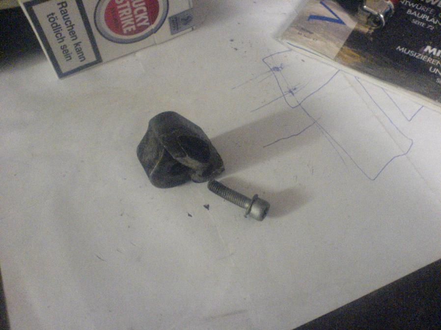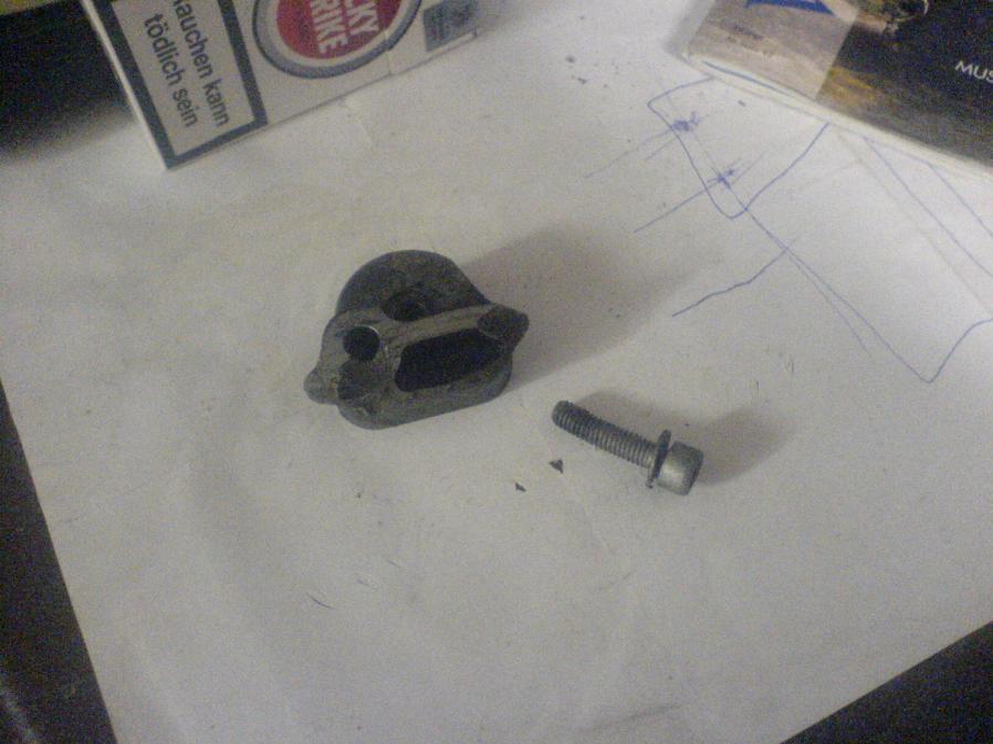 Folgende Vorgeschichte gibts noch zu sagen: bei dem Omega war der Zahnriemen gerissen und somit kam jetzt alles neu.Er hatte sich dann(nachdem er gerissen war) komplett um die Kurbelwelle gewickelt,und ich nehme an,damit den halter vom Block gesprengt.Man sieht ja gut,wie schief die Schraube ist (Wofür ist die eigentlich?)