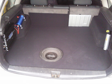 Ich hatte am wochenende etwas langeweile und habe mal etwas mein kofferraum verändert.Verbaut ist ein 30 er subwoofer (sonic von monacor) in einem 25 liter geslossenem gehäuse in der reserveradmulde ,kondensator 1 farat und eine monacor entstufe und viel schwarzer stoff
