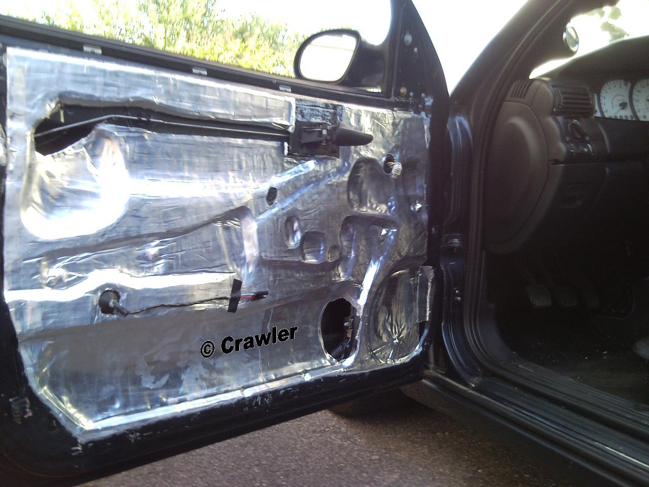 - für Doorboards MUSS man dämmen, da sonst das Karrosserieblech anfängt zu vibrieren/schäppern was den Hörgenuss trübt. Es reicht aus ein paar Streifen an das Aussenblech und Innenblech zu kleben. Ein kleiner Faustschlag auf das Blech und man merkt den Unterschied, bzw hört ob man seine Arbeit gut verrichtet hat. Hierfür muss man die nervige Folie entfernen, dämmen und wieder aufkleben. Das geht einmal aber mehr auch nicht. Da ich bisher schon zu oft an den Türen rumgebastelt habe, hatte meine Originale Folie den Geist aufgegeben. Somit musste ich auf eine dicke Folie aus dem Baumarkt umsteigen und diese mit doppelseitigem Klebeband ankleben. Hält!