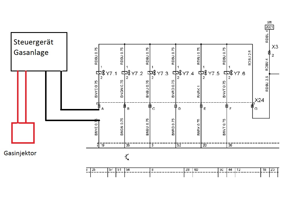 Ich hab mal den Anschluß der Gasanlage symbolisch für den ersten Zylinder in den Schaltplan vom Y26SE / Y32SE eingezeichnet.