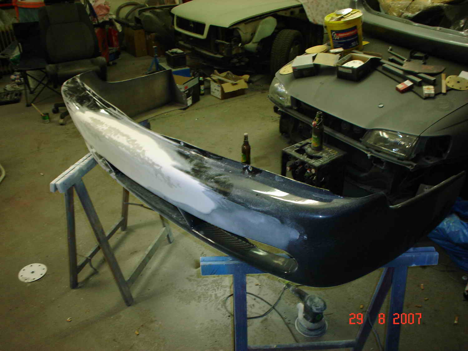 So wieder ein wenig geschafft, aber es kommt immer mehr dazu ! Ich musste von meiner Heckschürze das komplette Gelcout runter schleifen, da es bis runter zum GFK gerissen ist.